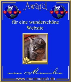 Diesen schönen Award habe ich von Monika und Smokey erhalten. Dies ist der erste "freiwillige" Award, ohne dass ich mich dafür beworben habe. Herzlichen Dank, ich habe mich riesig gefreut.