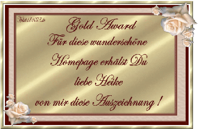 Da meine Seite, laut Heidi, sehr liebevoll und informativ gestaltet ist, hat sie mir auch noch den goldenen Homepage-Award verliehen. Auch hierfür bedanke ich mich ganz herzlich.