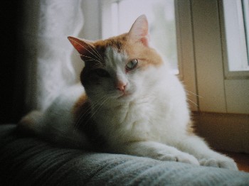 Er lag hier sehr oft auf der Fensterbank und wartete, dass ich von der Arbeit kam. Natürlich war er auch Freigänger, aber er hatte leider nicht die Möglichkeit aus dem Haus zu kommen, wenn keiner da war. Aber lieber war er sowieso im Haus, da er draußen sehr ängstlich war.